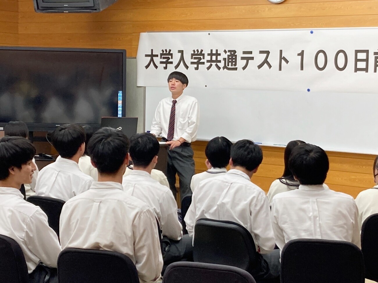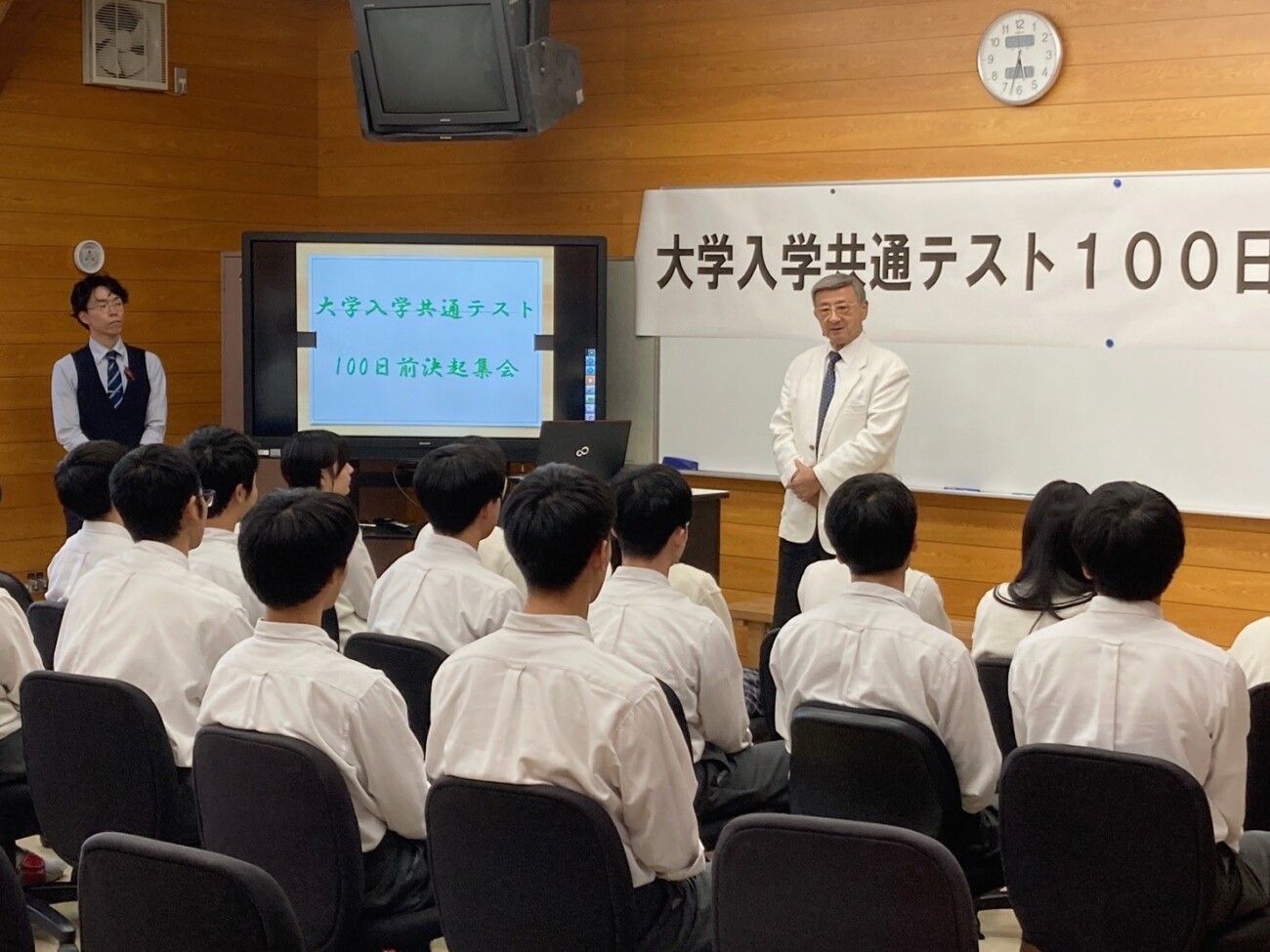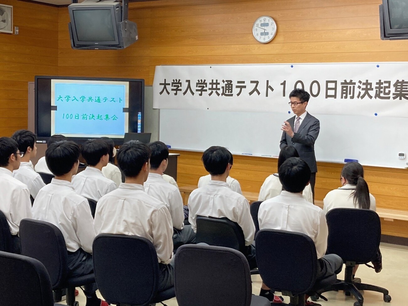 10月5日(木)智翠館棟多目的ホールにて大学入学共通テスト100日前決起集会が行われました。