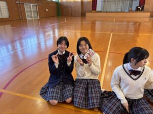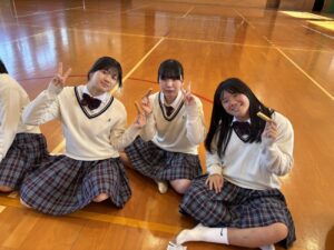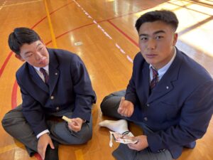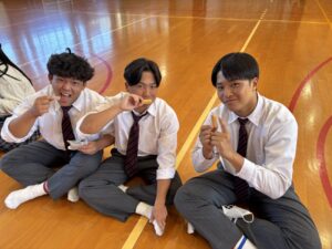 園児のみなさんは先生や生徒と手をつなぎ、落ち着いて本校体育館まで避難することが出来ました。また、体育館に到着してからは園児のみなさんと一緒に防災食を食べました。