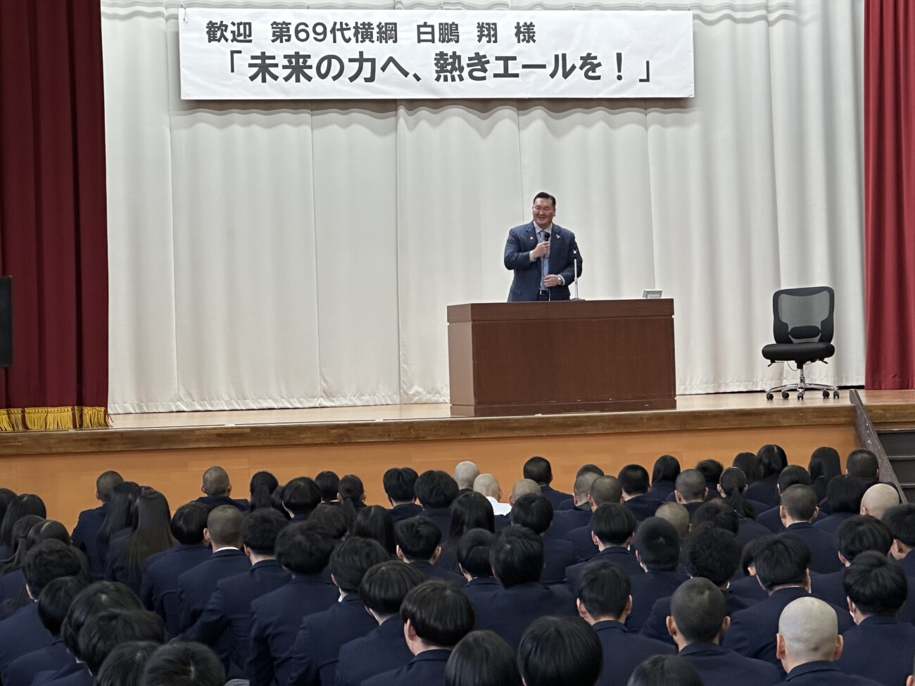 12月8日、歓迎の拍手の中、第69代元横綱・白鵬翔さんが来校されました。