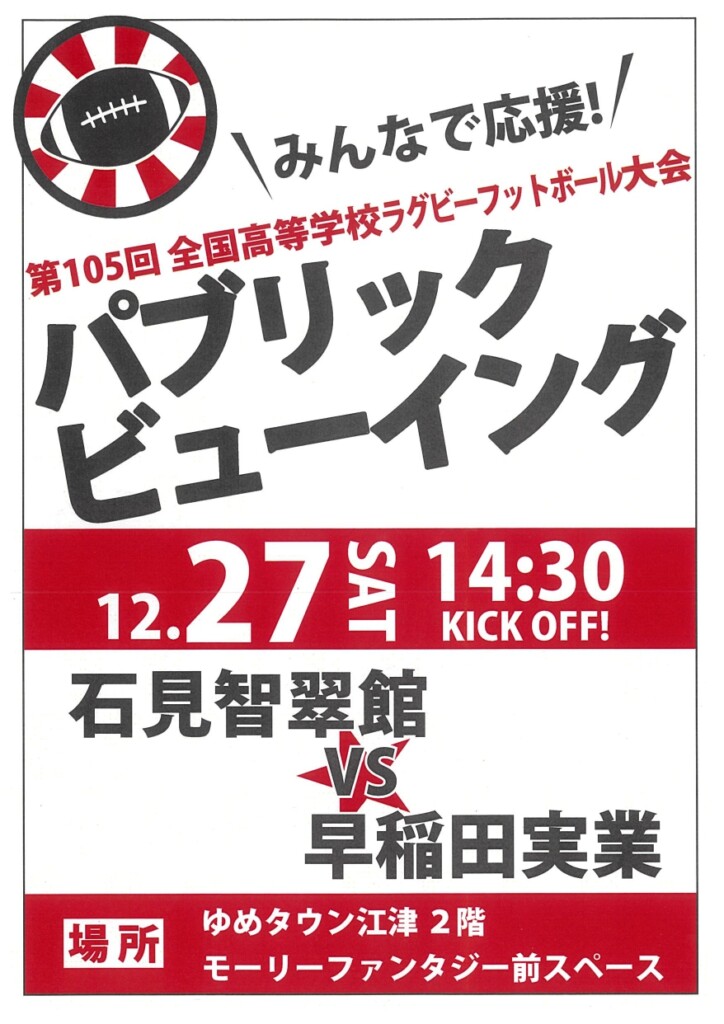 12月27日(土)に行われる智翠館VS早稲田実業の試合を14:30よりゆめタウン江津2階ゲームセンター前の広場にてパブリックビューイングで放送していただけることになりました。応援よろしくお願いします!! ゆめタウン江津 花園大会パブリックビューイングについて